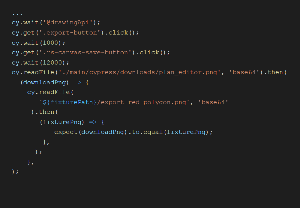 So far so good. We now need to compare the downloaded PNG to a prepared fixture PNG, which needs to be identical. Unfortunately Cypress wait() doesn’t support waiting on events like file downloads, so we use it with a fixed timeout to make sure the file download is complete. We then use readFile() to read the file using base64-encoding and compare our files.