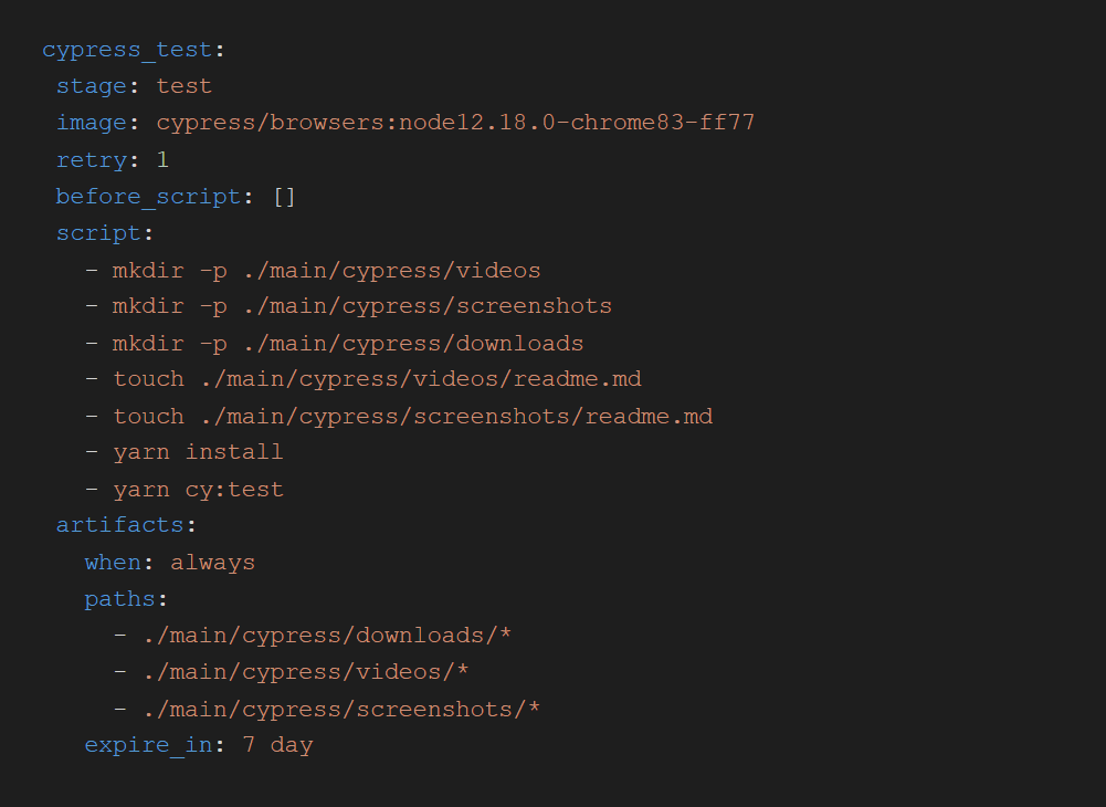 To run the Cypress tests in our gitlab-CI pipeline, we add a test stage in the .gitlab-ci.yml file. Here we make sure all Cypress requirements and assets are present, Cypress is installed and the tests are run. As mentioned previously, the mapset login credentials are passed in using gitlab environment variables.